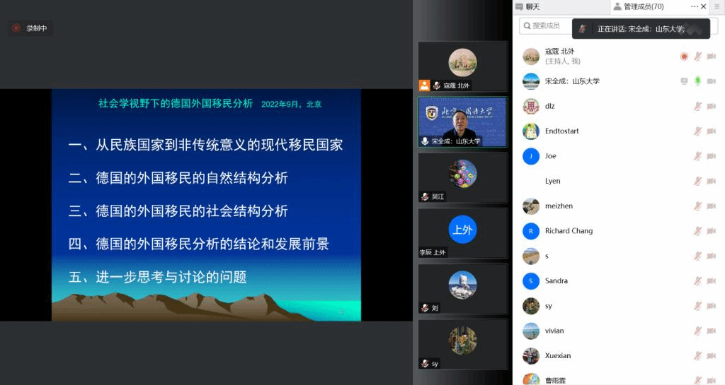 2022年9月30日下午,“北外德语国家讲堂”系列新一期讲座以线上形式顺利举办。山东大学宋全成教授应邀做了题为“社会学视角下的德国外国移民分析”的讲座。讲座由太阳成集团tyc33455党总支副书记、院长吴江教授主持。