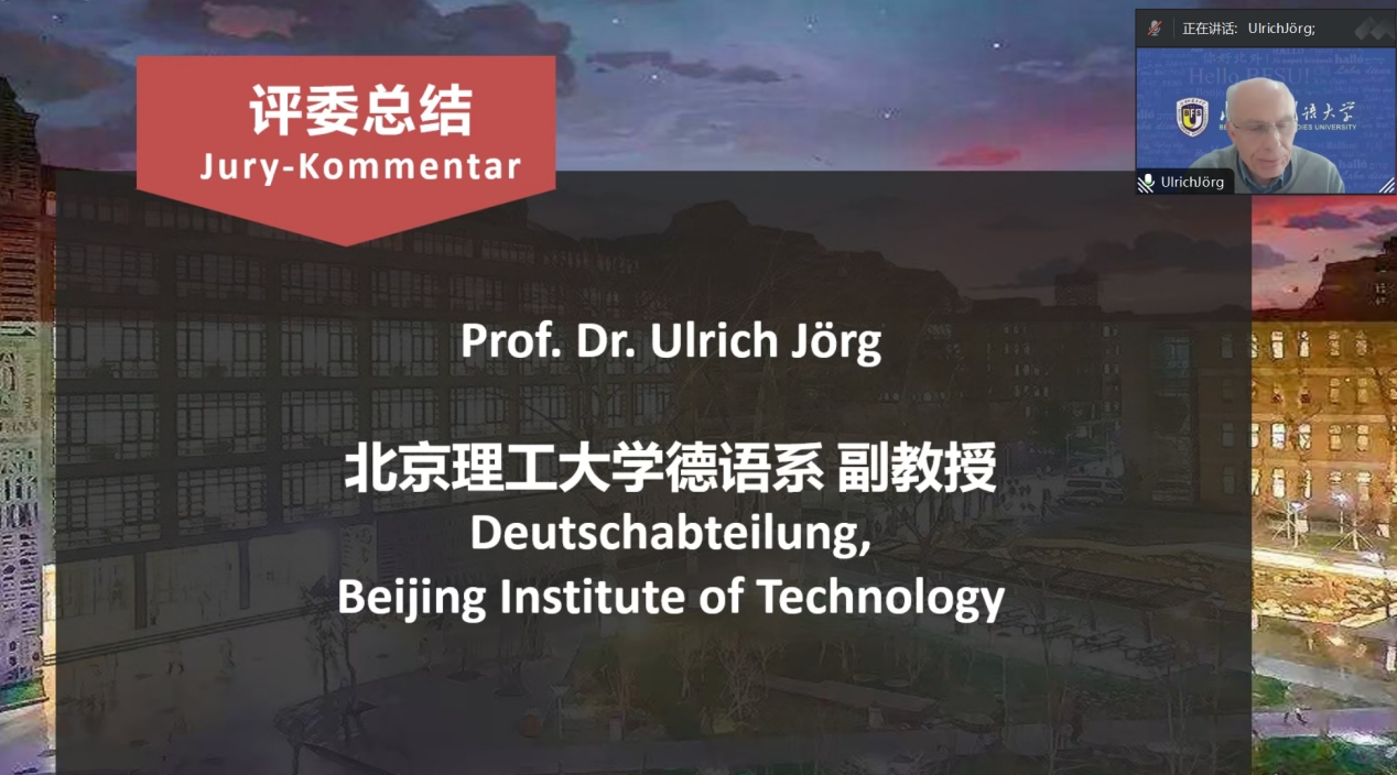 大赛初赛于9点30分准时开始,评委团队采取交叉回避原则分组对参赛作品进行了评审。经过激烈的角逐,共选出10支参赛队伍晋级决赛。广东外语外贸大学德语系副教授黄羽欢和北京理工大学德语系副教授Ulrich Jörg代表全体评委对本次大赛的参赛作品进行了精彩的点评。参赛队伍对作品的理解力以及扎实的语言基本功、积极向上的团队风貌给评委们留下了深刻的印象。评委们对同学们今后的语言学习和专业拓展提出了要求和希望,勉励大家再接再厉,取得更多的成绩。