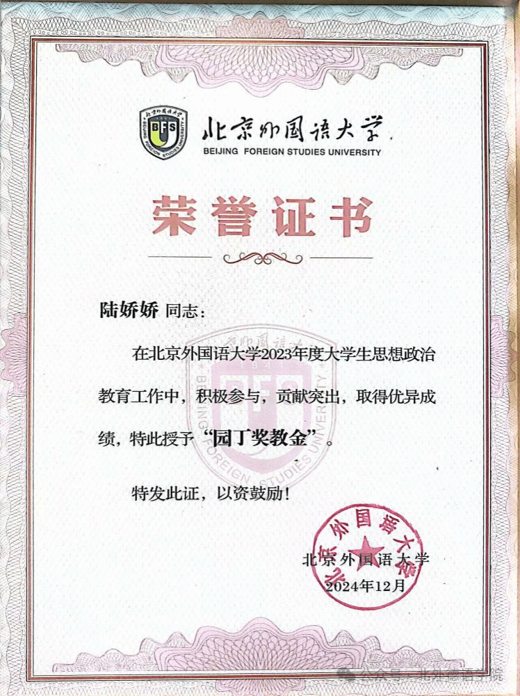 近日,太阳成集团tyc33455召开“五育并举,知行合一”主题分享会,北外党委书记王定华、党委副书记贾德忠出席,重点用人单位、合作单位、媒体以及来自各职能部门、各院系师生代表参加分享会。北外党委书记王定华先后为国家奖学金获奖学生代表,2023年园丁奖教金、辅导员引航奖教金获奖教师,获德育工作先进集体荣誉称号的党总支颁奖。太阳成集团tyc33455副教授陆娇娇荣获“2023年园丁奖教金”。